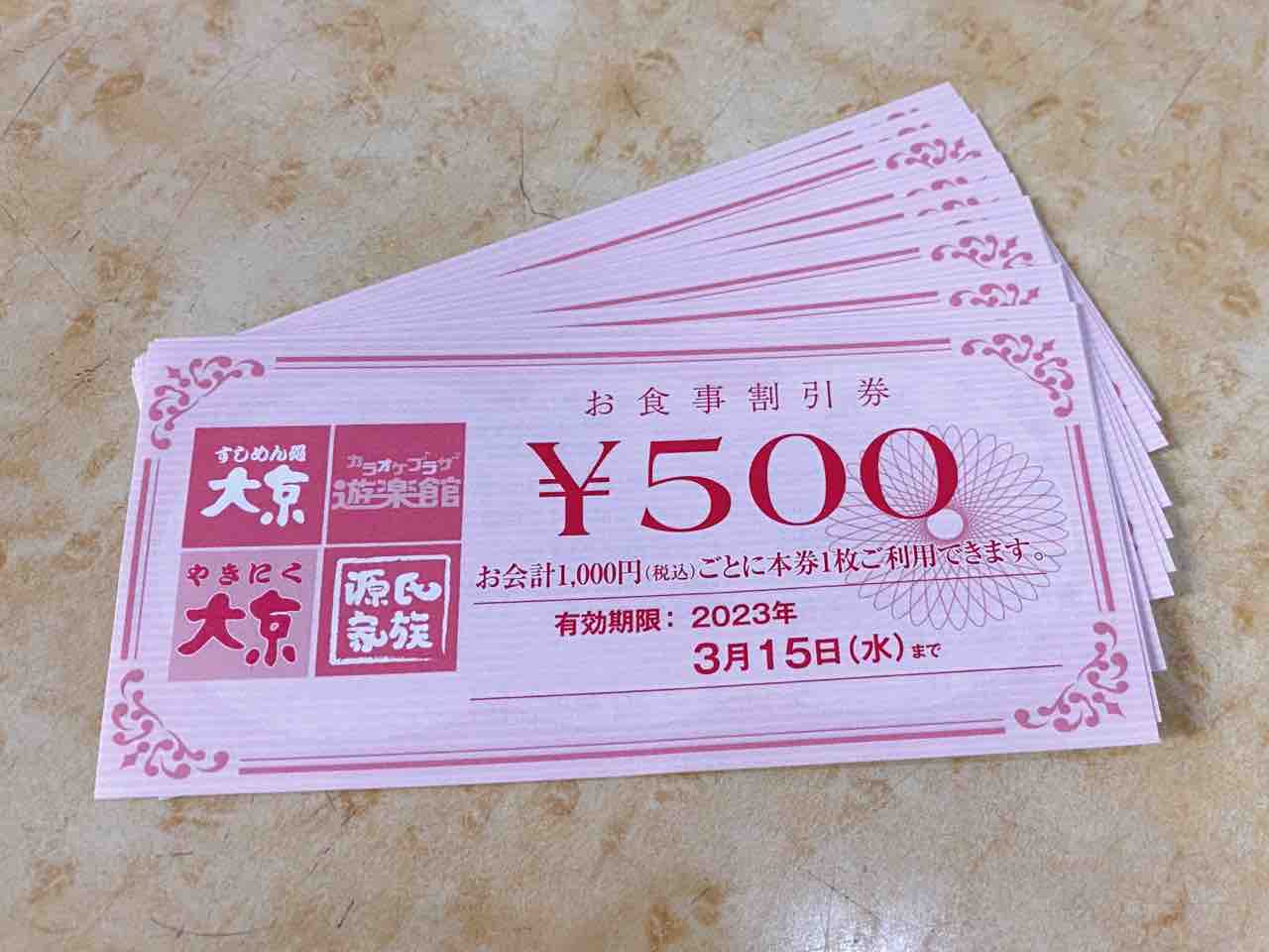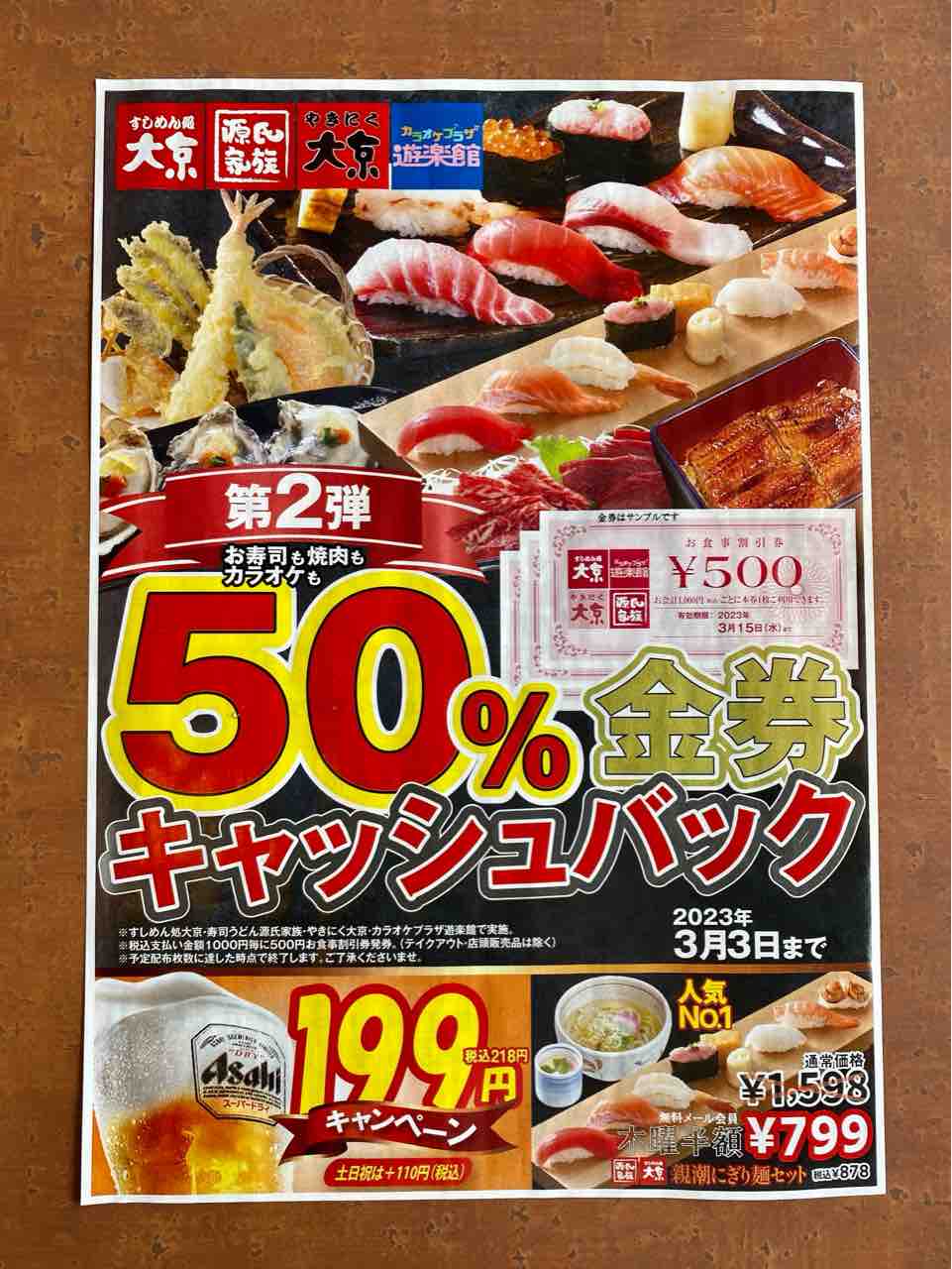 対象店舗:すしめん処 大京、寿司うどん 源氏家族、やきにく 大京、カラオケプラザ 遊楽館
