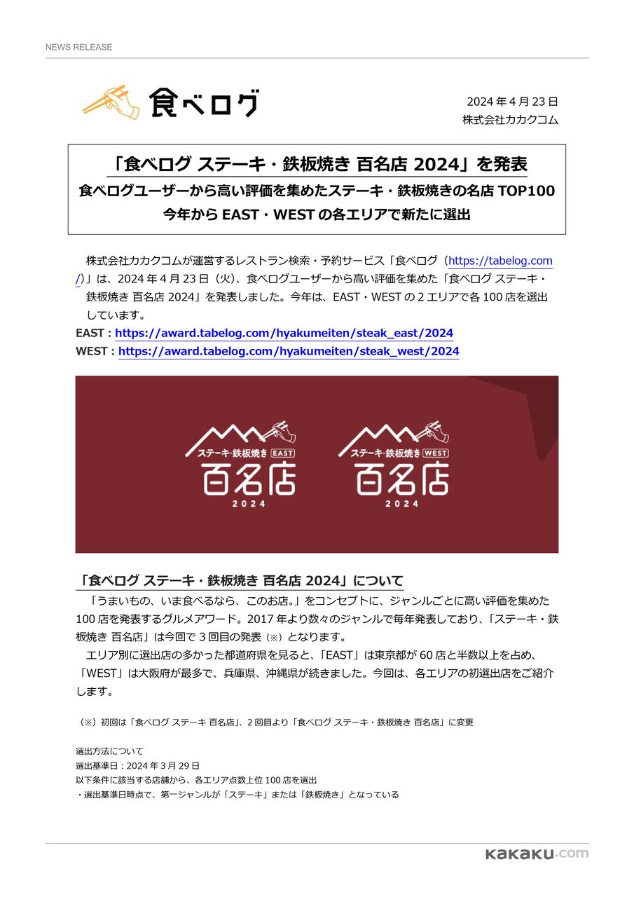 ※『食べログ ステーキ 百名店2024』の選出店は、こちら。