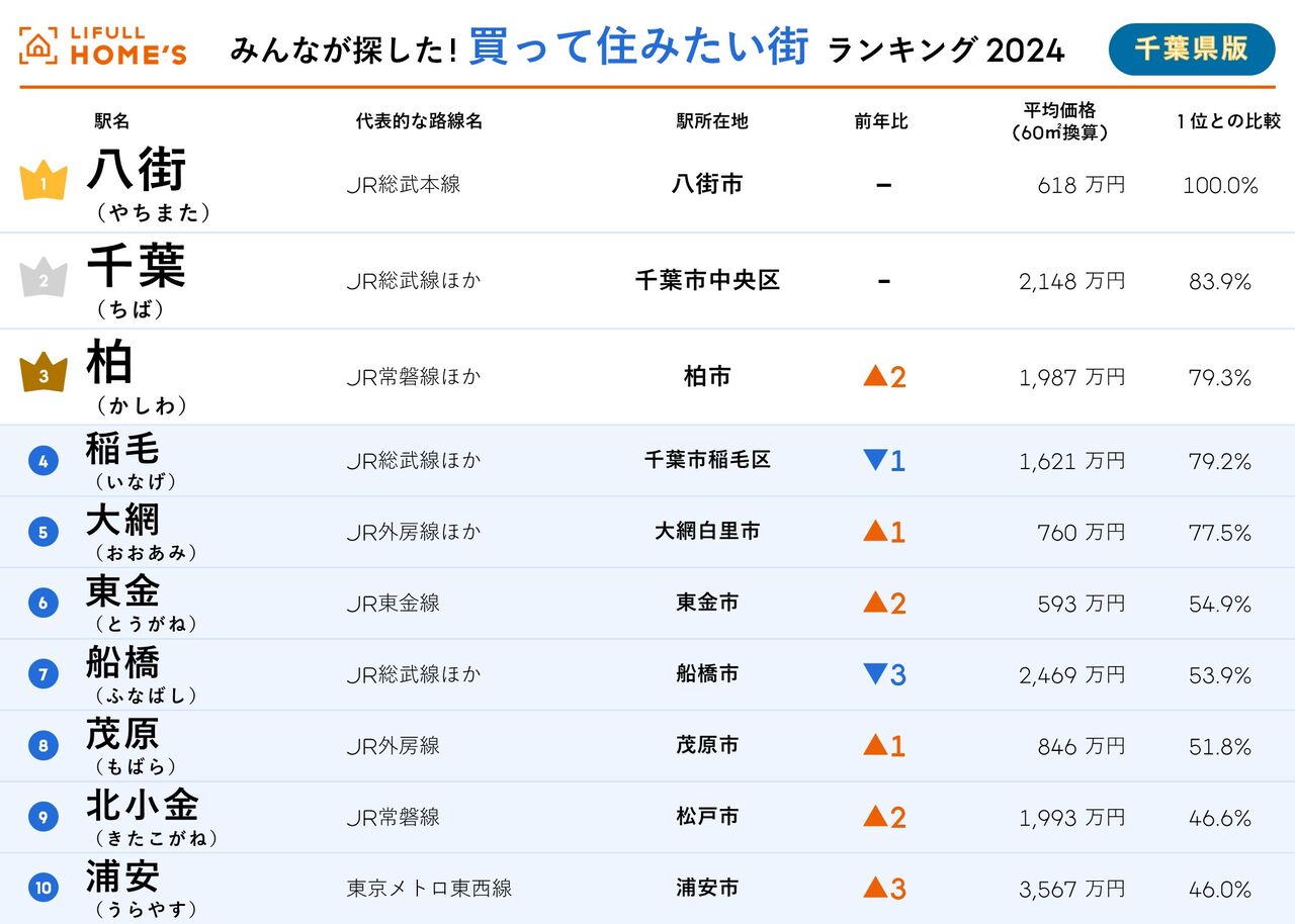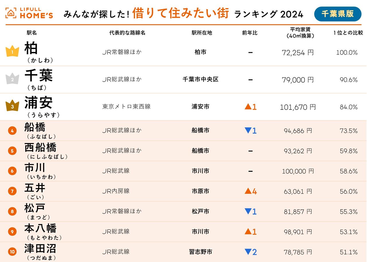 『千葉県版「2024年 LIFULL HOME'S みんなが探した!住みたい街ランキング」』