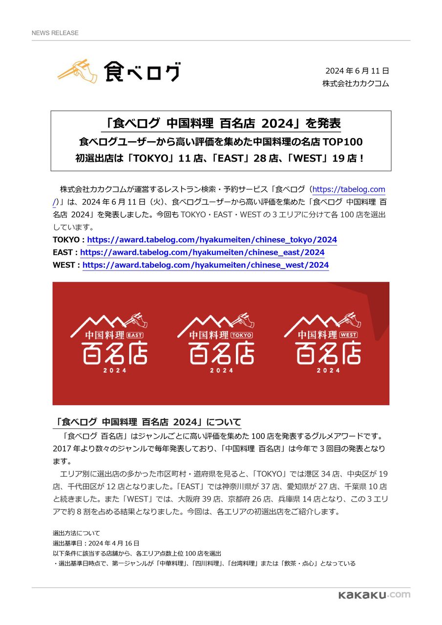 ※『食べログ 中国料理 百名店 2024(EAST)』の選出店は、こちら。