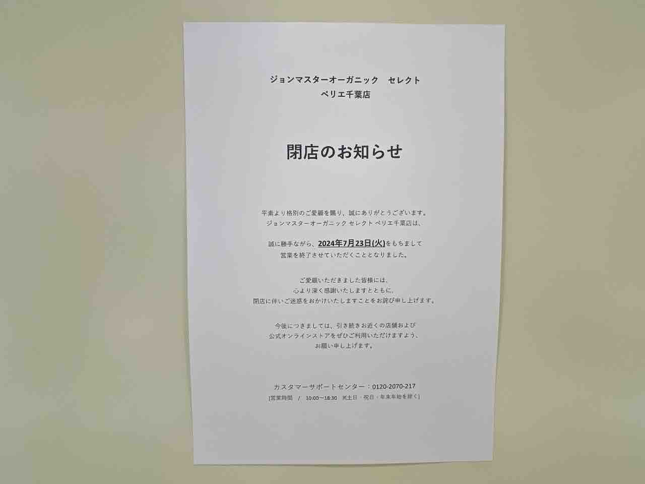 お知らせには、7月28日閉店